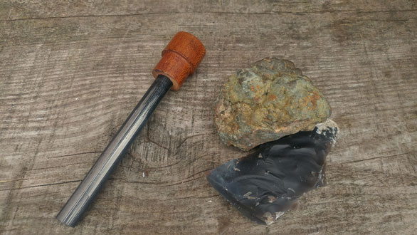 Figure 1; A modern firesteel on the left and flint and iron pyrites on the right.