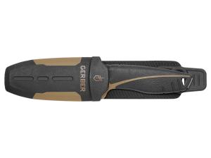 Designed by professional hunters and guides, this knife is a new standard. A full tang high-carbon stainless steel blade is anchored by a soft rubberized handle, allowing for safe, quick field dressing or camp tasks. The dual-lock sheath includes a built-in carbide sharpener.