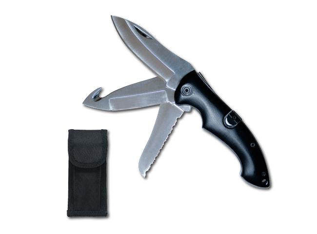 EMI's Trilogy Rescue Knife is the first and only triple blade rescue knife. Three separate stainless steel blades give the rescuers the option of a 3" smooth blade, a 2 1/2" blunt tip serrated blade or a combination of a 2" smooth blade with a seat belt cutter blade tip. All blades open easily with an indented thumb nail groove and lock in the open position for safety. Trilogy's high impact plastic handle features push button closure tabs for all three knives. It comes complete with a special design holster which can be worn horizontally or vertically. Length open 7 1/2". Length closed 4 1/2". Approximately 10 oz.